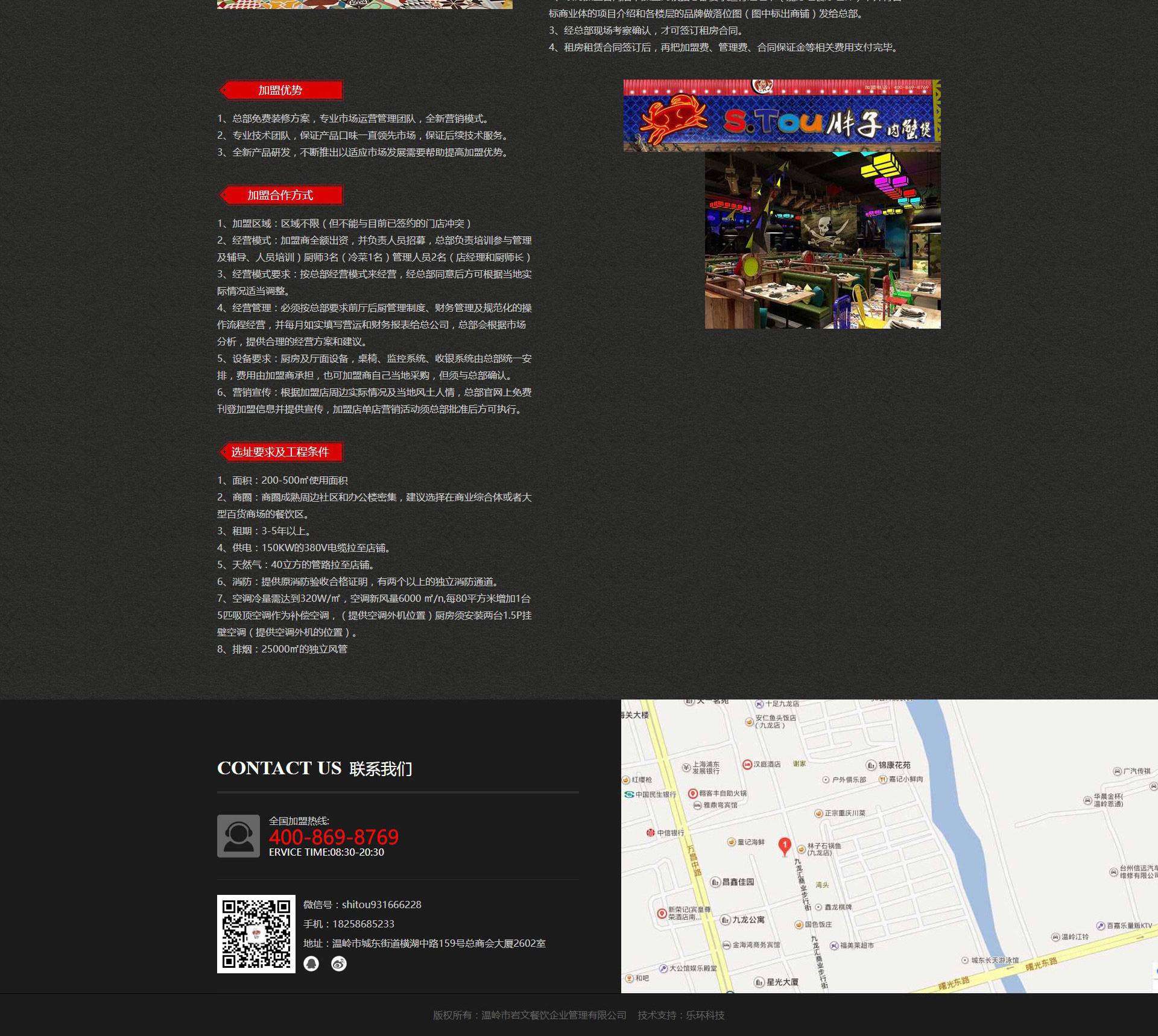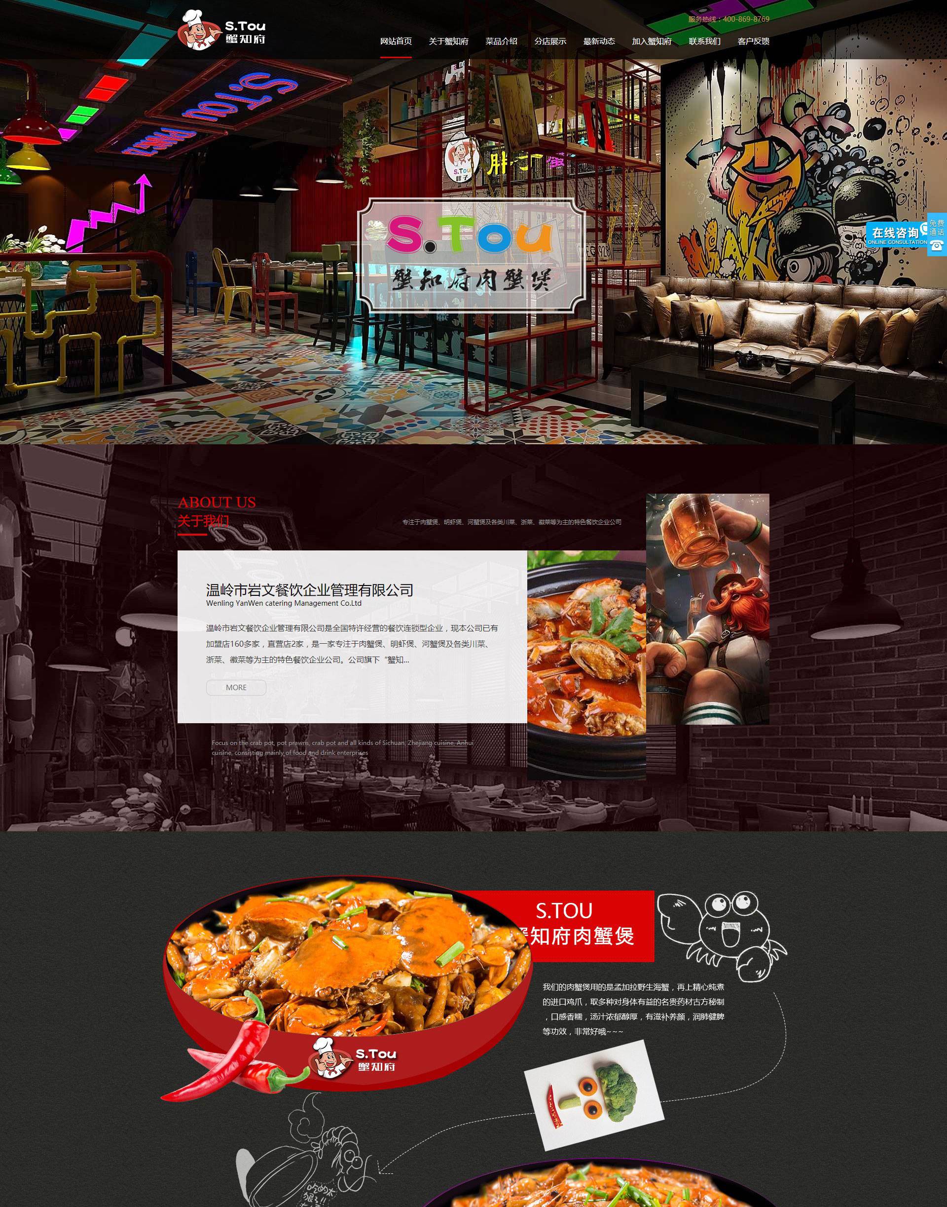 溫嶺市巖文餐飲企業(yè)管理有限公司是全國(guó)特許經(jīng)營(yíng)的餐飲連鎖型企業(yè),現(xiàn)本公司已有加盟店160多家,直營(yíng)店2家,是一家專注于肉蟹煲、明蝦煲、河蟹煲及各類川菜、浙菜、徽菜等為主的特色餐飲企業(yè)公司。公司旗下“蟹知府肉蟹煲“.“S.TOU胖子肉蟹煲”在國(guó)內(nèi)是較知名的餐飲品牌。2008年5月,浙江海鹽一位廚師與螃蟹有了第一次的親密接觸,從此便不可收拾的愛(ài)上了肉蟹煲。