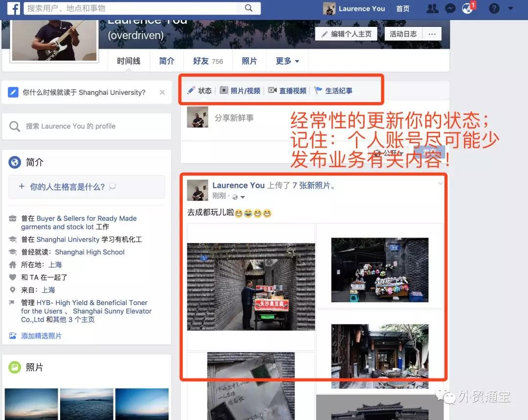 例如個(gè)人賬號(hào)盡可能少展示你的企業(yè)信息。更豐富的興趣愛(ài)好、更多的個(gè)人生活碎片更容易引起你好友的共鳴——老外的工作和生活是涇渭分明的。