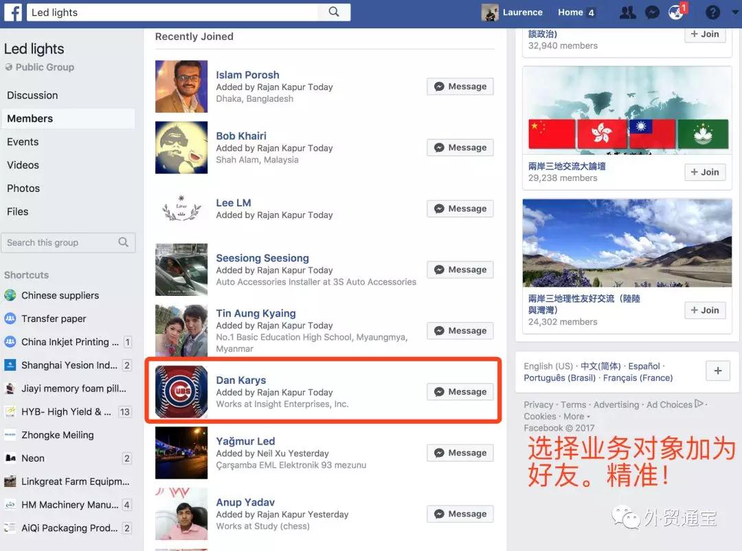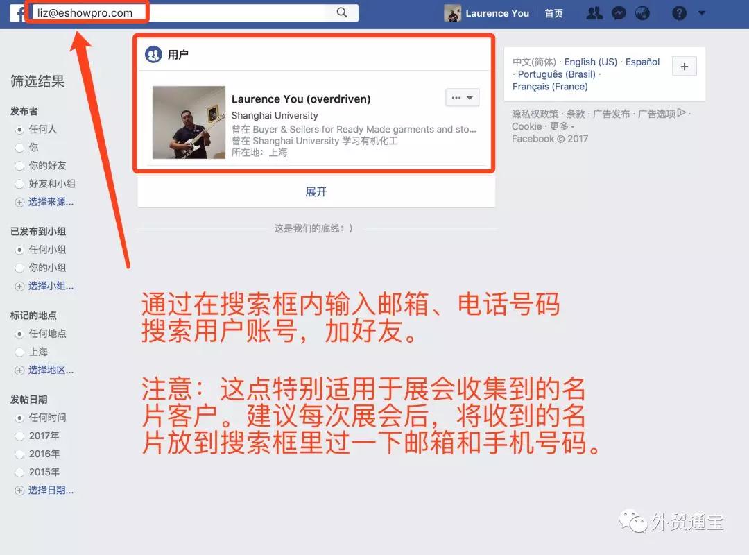 收到的詢(xún)盤(pán),回復(fù)后沒(méi)消息了?展會(huì)上見(jiàn)過(guò)一面的客戶(hù)沒(méi)下文了?沒(méi)關(guān)系,只要有他的名片,我們把郵箱或者電話(huà)號(hào)碼放到FACEBOOK上搜索一下,說(shuō)不定我們就能找到他的社交賬號(hào),然后長(zhǎng)期互動(dòng)、慢慢跟進(jìn)哦!