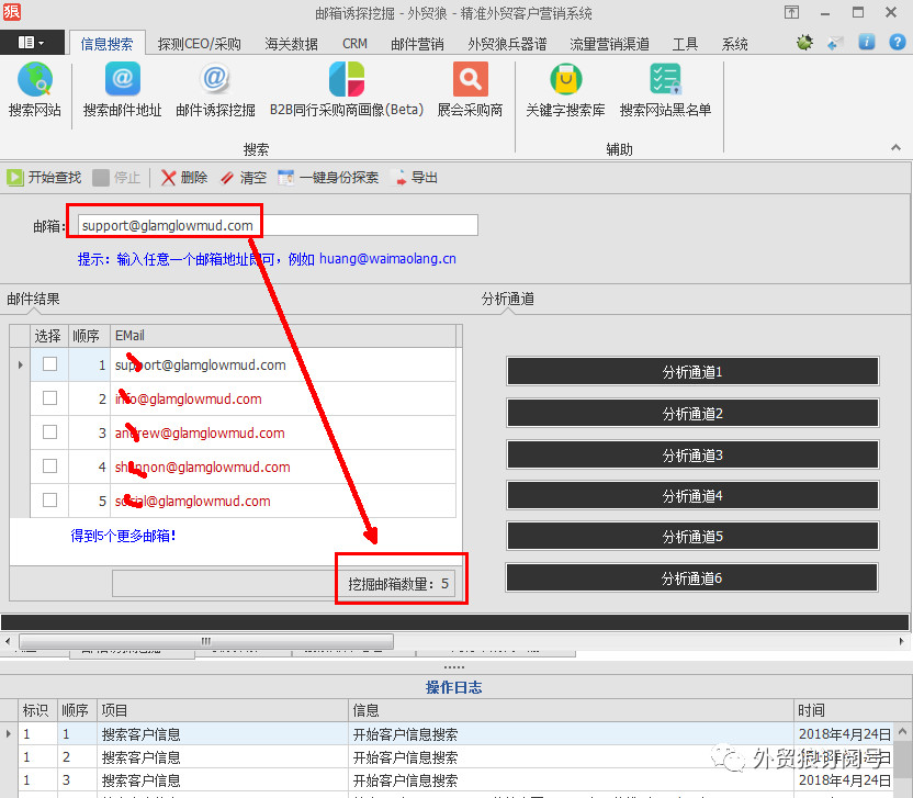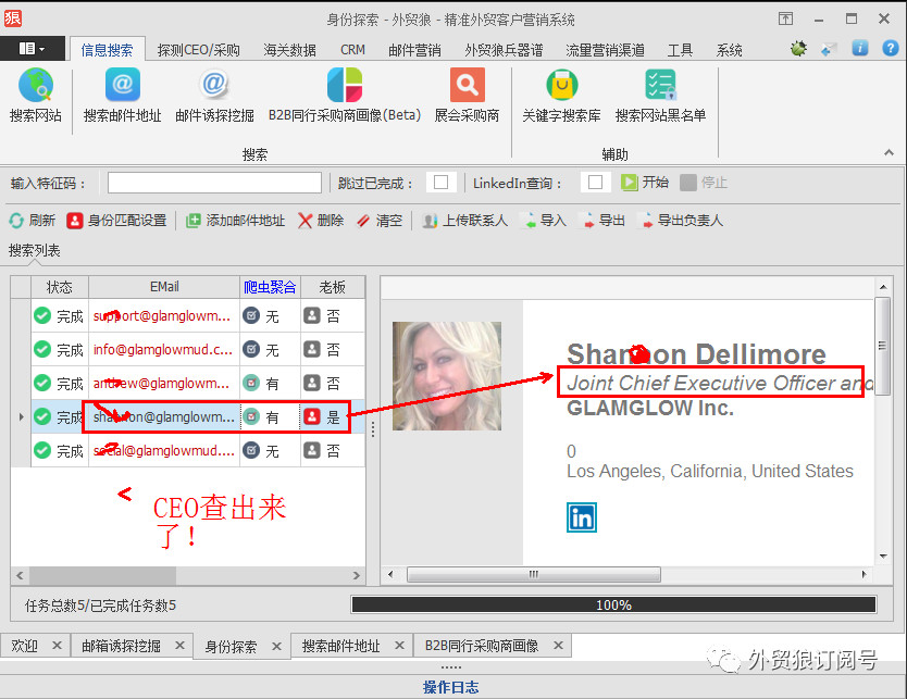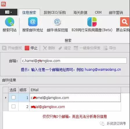 客戶希望以這個(gè)郵箱(c.hamel@glamglow.com )為線索去分析這家公司的采購(gòu)或者老板的郵箱,而通過(guò)外貿(mào)狼,只能查的出來(lái)2個(gè)郵箱,而且無(wú)法分析身份信息。