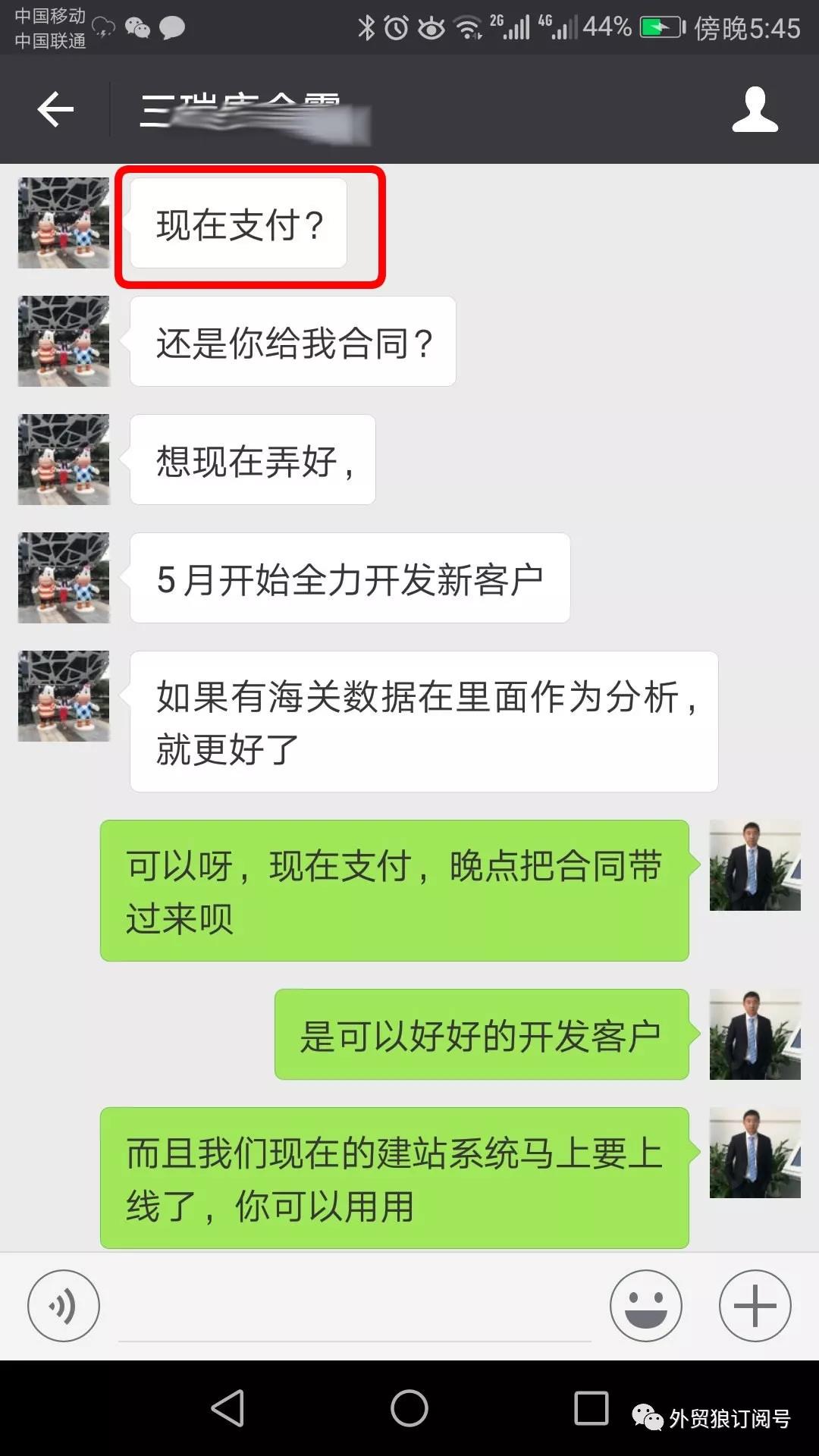 外貿(mào)狼是一款工具,的的確確非常高效獲取精準(zhǔn)線索。要發(fā)揮出他所有的價(jià)值,得結(jié)合外貿(mào)人的專業(yè)度和外貿(mào)知識(shí)。就如這個(gè)案例,如果連這套思路都沒(méi)有,很有可能就丟失了這個(gè)客戶,加油!感謝唐總信任,感謝直接網(wǎng)絡(luò)轉(zhuǎn)賬合作,現(xiàn)在合作外貿(mào)狼,總20個(gè)國(guó)家的建站系統(tǒng)哦!加油!
