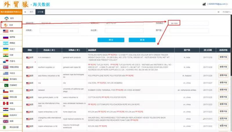 打開了海關數(shù)據(jù),這里共有52個國家+兩個地區(qū),共54個,選擇對應國家或地區(qū)(PS:現(xiàn)在外貿狼升級了,可以直接一鍵查詢全球的客戶)之后,可以用貨品描述搜索,也可以用采購商、供應商來直接搜索,建議用大詞,寬泛一些詞來搜,如下,我使用關鍵詞“pp rope”搜索客戶,如下: