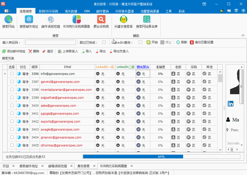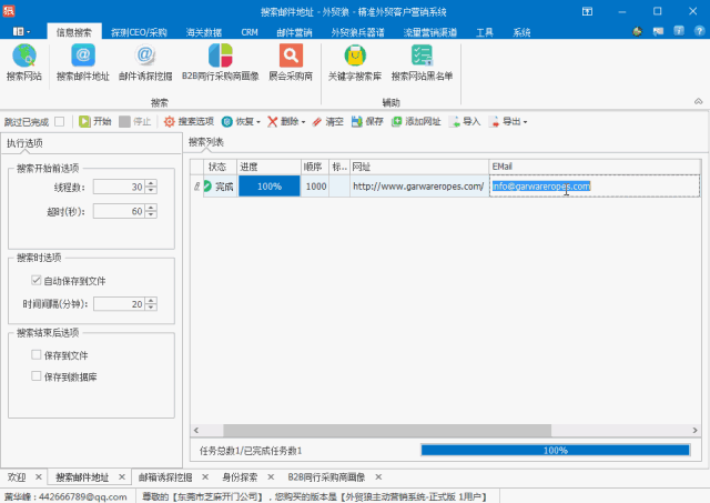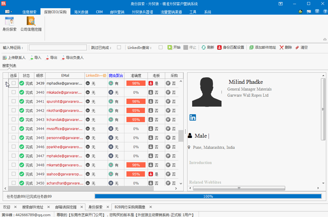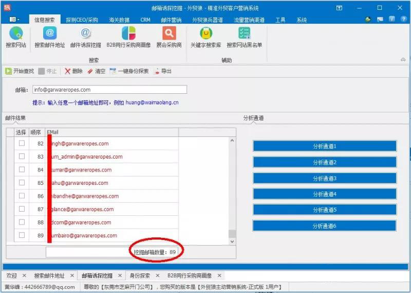 利用外貿狼的深度挖掘功能和搜索引擎爬蟲技術,快速挖掘出企業(yè)的89個企業(yè)郵箱。