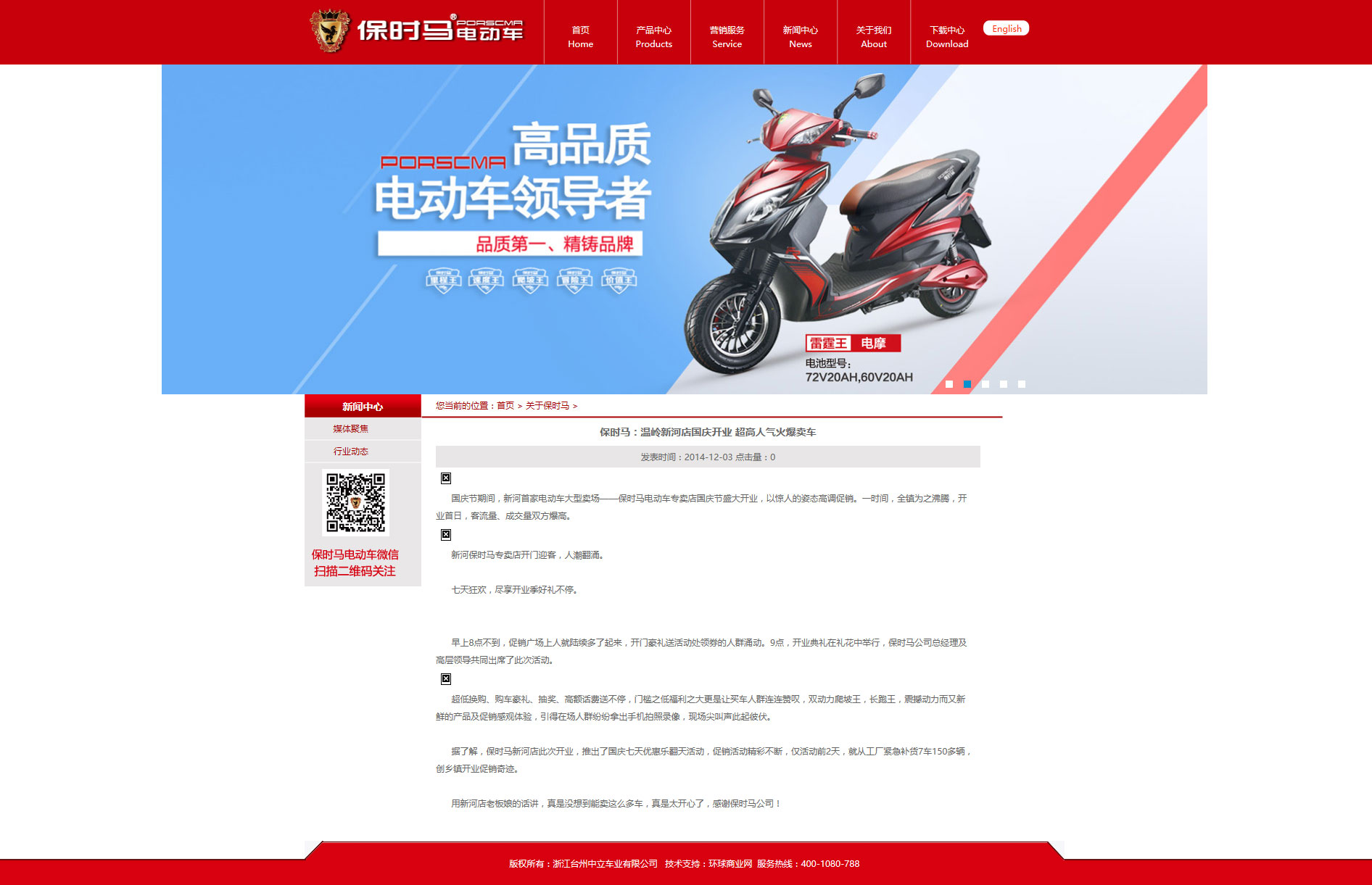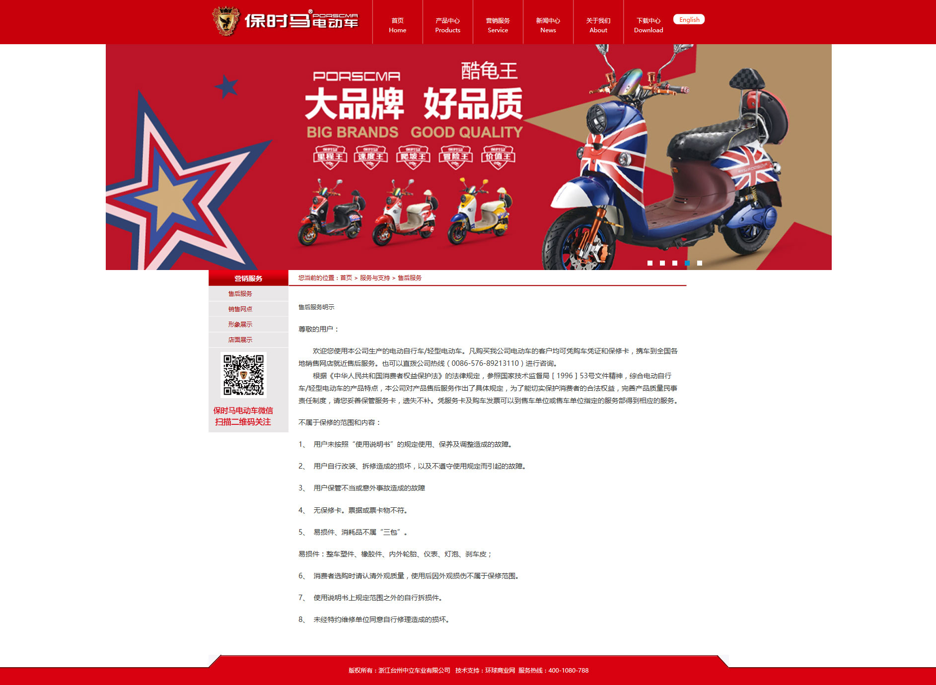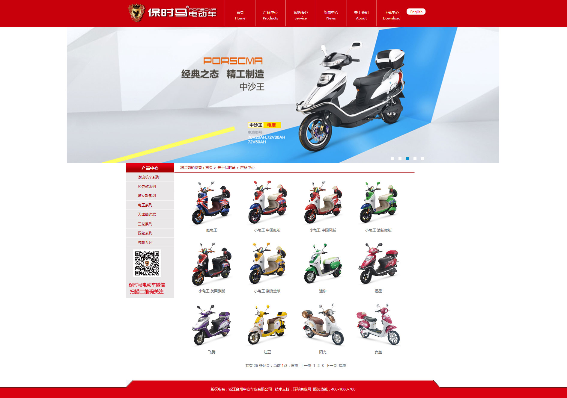 公司旗下保時馬、永奔兩大品牌,已向市場投放數(shù)百款樣式新穎,性能優(yōu)良的電動車。公司以多元化營銷模式在全國建立了較為完善的銷售服務體系,在各個省市設有代理商以及銷售網(wǎng)點,按照售后服務的要求,在各個省市設立了三包配件庫,駐外業(yè)務員、三包服務人員150余人。系列產(chǎn)品暢銷全國并出口國外。